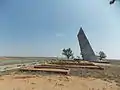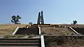К обелиску ведёт лестница с несколькими проёмами. В подножии лестницы установлен информационный памятный знак в виде широкого прямоугольника с надписью на красном фоне: