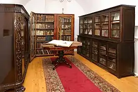 В музее воссоздан интерьер библиотеки бывшего коллегиума. Здесь есть старинные шкафы с книгами, которые датируются XVI—XIX веками. Здесь есть издание «Атласа Российской империи» 1745 года, книги на французском языке «Басни Ла-Фонтена» 1675 года, «Письма малоизвестных особ», которые датируются 1598 годом, «Основ философии и логики» 1557 года на латыни[1]. Есть книги, которые читал Григорий Сковорода: произведения Ломоносова, Горация, Плутарха, Марка Аврелия, Руссо, Прокоповича[3].