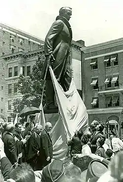 Протесты против возведения монумента не стихли даже тогда, когда 21 сентября 1963 года церемонию закладки фундамента в центре Вашингтона посетило более двух тысяч человек[4][15]. В ноябре того же года к остановке строительства призвал один из членов Национальной комиссии по планированию столицы, которая должна была утвердить проект памятника в соответствии с резолюцией Конгресса[16][26]. В следующем месяце секретарь по внутренним делам Стюарт Юдалл заявил, что хочет пересмотреть планы по возведению мемориала[5][27]. Попытки сорвать строительство в конечном счете не возымели успеха, когда планировщики столицы заявили, что им не хватает полномочий для того, чтобы остановить возведение статуи[28].