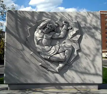 На рельефе стелы изображён подвергшийся мучениям греческий бог Прометей. Памятник и стела располагаются на четырёхступенчатой платформе, окруженной каменной площадью[7], на которой находятся круглый гранитный фонтан[61], скамейки и газон, обрамлённые деревьями и кустарниками[62].