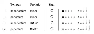 В конкретном музыкальном сочинении бинарное и/или тернарное соотношение длительностей задавалось, как правило, сразу на двух уровнях: как (1) тип соотношения бревиса и семибревиса (такое соотношение называлось словом темпус — лат. tempus) и (2) тип соотношения семибревиса и минимы (т. наз. пролация – лат. prolatio)[1]. Графически темпус и пролация отображались особыми знаками, которые выставлялись в начале первого нотоносца (круг, полукруг, с точкой внутри или без этой точки) — эти знаки в науке традиционно рассматриваются как предшественники позднейших обозначений тактового размера. Комбинация темпуса и пролации, таким образом, определяла фактическую протяжённость каждой ноты и паузы в целом, выводимую из частного соотношения каждой пары соседних ритмических уровней.