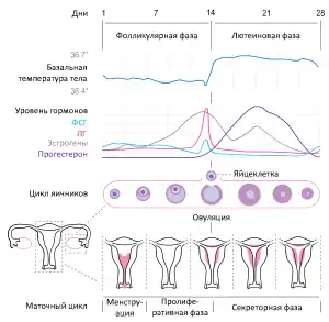 Менструа́льный цикл (от лат. menstruus «месячный «цикл»; ежемесячный») — это регулярное естественное изменение, которое происходит в женской репродуктивной системе (особенно в матке и яичниках), что делает беременность возможной[1][2]. Цикл необходим для производства ооцитов и для подготовки матки к беременности[1]. Менструальный цикл происходит из-за изменения уровня гормонов[3]. Этот цикл приводит к утолщению функционального слоя слизистой оболочки матки и росту яйцеклетки (что необходимо для наступления беременности)[3]. В цикле средней длительности (28 дней) яйцеклетка выходит из яичника примерно на четырнадцатый день; функциональный слой слизистой матки обеспечивает питание эмбриона после имплантации[3]. Если беременность не наступает, функциональный слой эндометрия отторгается, что и называется менструацией[3].