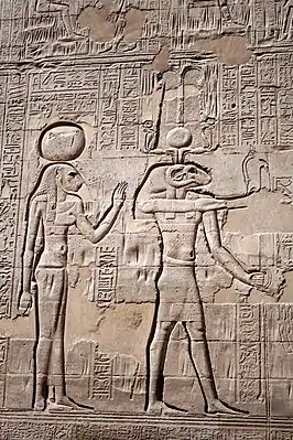 ![]() Богиня Менхит стоит слева от Хнума. Барельеф на внешней стене храма в Эсне | ||||||||