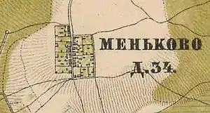 МЕНЬКОВО — деревня владельческая при колодце, число дворов — 27, число жителей: 58 м. п., 89 ж. п. (1862 год)[13]