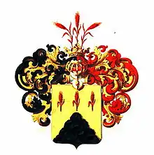 Щит увенчан дворянским коронованным шлемом. Нашлемник: вертикально три червлёных колеса. Намёт: справа чёрный с золотом, слева червлёный с золотом[1].