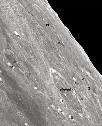 - Образование сателлитного кратера Меркурий M относится к нектарскому периоду[1].