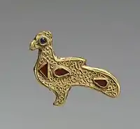 Франкская фибула в виде павлина[5], VI век, золото поверх бронзы; синий гранат, красная стеклянная паста, Walters Art Museum.