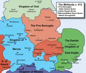 В 852 году Бургред взошел на престол и вместе с Этельвульфом Уэссексским покорил Северный Уэльс. В 868 году вторгнувшиеся на острова датские викинги заняли Ноттингем. Викинги вытеснили Бургреда из его королевства в 874 году, а Кёлвульф II занял его место. В 877 году викинги захватили восточную часть Мерсии, которая стала частью Данелага[7]. Кёлвульф, последний независимый король Мерсии, остался править лишь западной половиной королевства и правил до 879 года[8]. Примерно с 883 года до 911 года Мерсией правил Этельред II под господством Уэссекса. Все монеты, отчеканенные в Мерсии после смерти Кёлвульфа II, были с именем короля Уэссекса[9]. Этельред II женился на Этельфледе, дочери Альфреда Великого, короля Уэссекса, и она правила страной со времени, когда ее муж заболел в последние десять лет своей жизни[10].