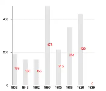 Из них: русских — 6 хозяйств, 30 душ; финнов-ингерманландцев — 85 хозяйств, 382 души; финнов-суоми — 3 хозяйства, 11 душ; поляков — 1 хозяйство, 2 души; латышей — 1 хозяйство, 5 душ. (1926 год)[16]