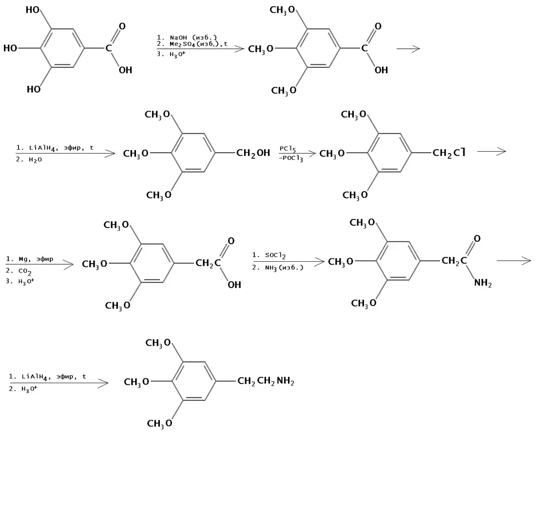 Получается из галловой кислоты и приведённых на схеме реагентов {A New Synthesis of Mescaline | Journal of the American Chemical Society (acs.org), https://doi.org/10.1021/ja01155a562}