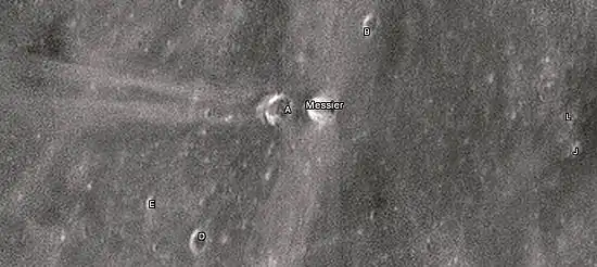 ![]() Снимок зонда Lunar Orbiter - V. Кратер Мессье (в верхней части снимка) и сателлитный кратер Мессье A. | |