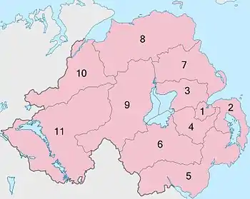 До 2015 года Северная Ирландия делилась на самоуправляемых 26 районов. С 1 апреля 2015 года их число было сокращено до 11.[1][2][3][4] Ниже представлены основные географические статистические данные.