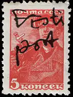 ![]() Надпись «Eesti Post» на марке СССР (ЦФА [АО «Марка»] № 693) шестого стандартного выпуска (Mi #Ib) | |