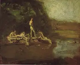Оригинальный текст (англ.)[показатьскрыть]For a picture ... like the Swimming Hole, a small sketch was made 8 x 10 inches [20 x 25 cm], then separate studies of the landscape and figures, to get the true tone and color, etc. The diving figure being the most difficult to paint, was first modelled in wax. This gave him a thorough knowledge of every form