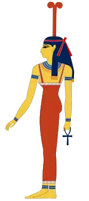 Изображалась в виде молодой женщины в головном уборе из разноцветных перьев, в сопровождении мохнатых уродцев-карликов Бесов и богини Таурт.