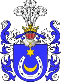 В голубом поле серебряная подкова, шипами обращённая вверх, в середине неё золотая звезда, а над ней полумесяц, рогами обращённый вверх[1].