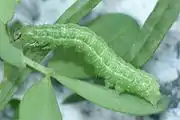 Гусеница, как правило, зелёного цвета, с белыми спинными и жёлтыми боковыми линиями[7], достигает длины до 40 мм, имеет 3 пары брюшных ног. Гусеницы многоядны; известно более 300 видов растений, которыми они питаются, в том числе культурные: горох (Pisum sativum), сахарная свёкла (Beta vulgaris), капуста (Brassica oleracea)[7], лён. В то же время питается и дикорастущими растениями: клевером, крапивой, стальником[7].