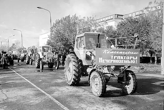 Колонна тракторов, сделанных из металлолома, который собран комсомольцами