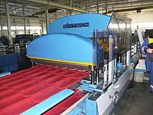 Производство металлочерепицы осуществляется на специальных полностью автоматических линиях путём профилирования металлического проката методом холодного давления. Сначала прокат проходит через систему профилировочных роликов, создающих волнообразный профиль. После этого холодной штамповкой формируется поперечная волна. Именно благодаря данному виду штамповки металлический лист приобретает форму черепицы. Далее осуществляется нарезка на листы необходимой длины. После этого уже готовые изделия укладывают в пачки и упаковывают в транспортные пакеты.