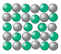 - второй, когда атомы примеси и растворителя имеют приблизительно одинаковые размеры, образуется твёрдый раствор замещения, в котором атомы растворённого элемента замещают атомы растворителя, так что атомы обоих сортов занимают места в узлах общей решётки. В таких случаях тоже вокруг каждого растворённого атома имеется искажённая область, а будет ли при этом решётка расширяться или сжиматься, зависит от относительных размеров атомов растворителя и растворённого вещества[12].