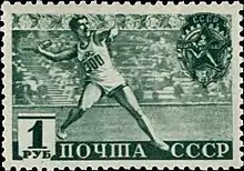 Марка СССР 1940 года с изображением метателя гранаты.