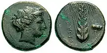 Метапонт чеканил свои монеты начиная с середины VI до н. э. В связи с тем, что центральную роль в процветании города играло производство и экспорт пшеницы, на одной из сторон метапонтских монет обязательно изображался колос пшеницы (на другой стороне было изображение богов — часто богини плодородия Деметры или кого-либо из мифических героев, либо также колоса). Встречаются также изредка монеты, где вместо колоса отчеканены мышь или саранча. Это означает, что в данный год выпуска монеты урожай был уничтожен или пострадал от бедствия.