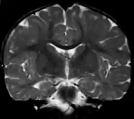 ![]() Вид фронтального среза головного мозга при метахроматической лейкодистрофии (МРТ). | |