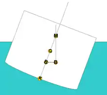 Поперечное наклонение плавающего судна. Метацентр обозначен M. Центр величины обозначен B