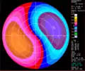 Идеализированный пример отображения скорости ветра на РЛС, полученный за счёт эффекта Доплера. Скорости приближения показаны синим цветом, а скорости удаления — красным.
