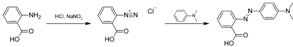 Получают из антраниловой кислоты и диметиланилина путём диазотирования. Кислоту растворяют в 8 % растворе гидроксида натрия, прибавляют раствор нитрита натрия, охлаждают льдом, после чего приливают к 8 % раствору соляной кислоты, получая диазораствор. Диазораствор после 15-минутного размешивания вливают в заранее приготовленный и охлаждённый раствор диметиланилина в 4 % соляной кислоте[3]: