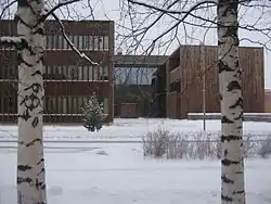 Здание представляет собой разомкнутый, лишенный одного угла квадрат с атриумом и небольшим внешним двором, образуемом его торцами. Простая форма здания с плоской крышей подчеркивается глухими торцовыми стенами из фактурного бруса, который используется вторично: на нем хорошо заметны признаки прежнего использования — следы износа и соединительные пазы. Окна здания частично скрыты за поперечными панелями из еловых досок. Главный вход в здание — из внутреннего двора, вымощенного камнем. Одна из внутренних стен корпуса полностью выполнена из стекла: через нее видны цельные косые балки в фойе, собранные в группы по четыре и поддерживающие крышу здания. В стену фойе с огромной плоскостью остекления встроен малый конференц-зал под названием «Шишка» (фин. Käpy) — лишённая окон аудитория в виде перевёрнутой лодки, отделанная чёрным просмолённым лемехом. Архитектурный ритм этого аскетичного здания задается вертикальным и горизонтальным расположением деревянных стройматериалов (бруса, панелей, досок обшивки во внутреннем дворе).