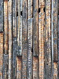 | Здание «Метла» зимой | Фактурная торцовая стена здания из старого бруса |