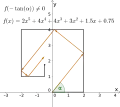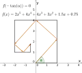 В полученную ломаную вписывается прямоугольная ломаная, соединяющая концы исходной, с вершинами, расположенными последовательно на продолжениях звеньев исходной ломаной. Угловой коэффициент вписанной ломаной, взятый с обратным знаком, является корнем исходного многочлена. Более того, любой вещественный корень может быть получен таким способом.