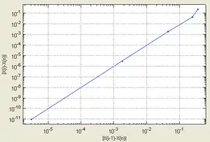 | Согласно способу практического определения скорость сходимости может быть оценена как тангенс угла наклона графика сходимости, то есть в данном случае равна двум. | |