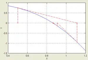 | Иллюстрация применения метода Ньютона к функции с начальным приближением в точке . | |
