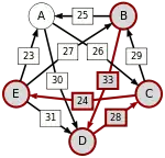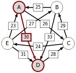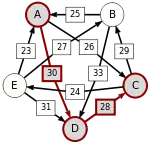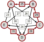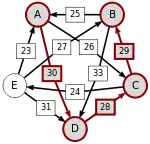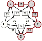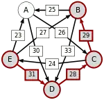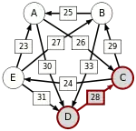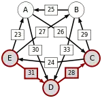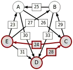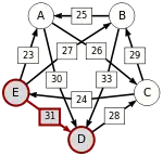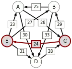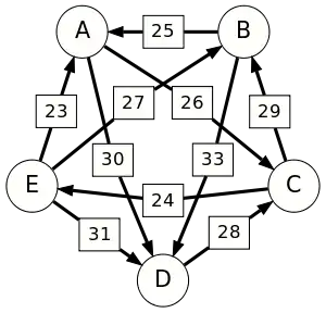 Сила пути — это сила его слабейшего звена (критическое звено). Пути, каждый переход в которых удовлетворяет d[X, Y] > d[Y, X] можно построить, пользуясь следующими кусочками последовательностей AC, AD, BA, BD, CB, CE, DC, EA, EB, ED.