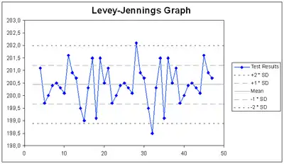 В промышленности для проведения статистического контроля наиболее широко используется графический материал, например, так называемые диаграммы Леви-Дженнингс (англ. Levey–Jennings). Они представляют собой график, где по оси X заносят временные характеристики, а ось Y отображает некий цифровой параметр, являющийся показателем качества. Например, уровень дефектности. Кроме того, график содержит несколько горизонталей, соответствующих среднему значению показателя качества (математическому ожиданию) и двум или трём стандартным отклонениям от него, а, в зависимости от задач, отклонениям соответствующим уровню разбраковки. Контроль за фактическим положением исследуемого цифрового параметра на диаграмме, обеспечивает быструю визуальную индикацию текущего уровня качества, что позволяет оперативно выявлять его недопустимые отклонения и, при необходимости, содействовать их устранению[3].