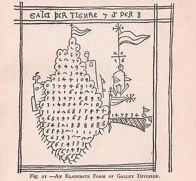 Метод галеры (метод зачёркивания) — способ деления, который был самым используемым в Европе примерно до 1600-х годов, и продолжал быть популярным до конца XVIII века[4]. Метод возник на основе китайского и индийского методов. Метод упоминается у Аль-Хорезми в работах 825 года[4], у Луки Пачоли в 1492 году[3].