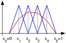 где кусочная область пространства . Есть много способов для выбора базиса . Выберем в качестве базисных функций такие , чтобы они представлялись прямыми линиями (полиномами первой степени):