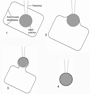 Интересная разновидность patch-clamp — nucleated patch. (Фиксация потенциала с клеточным ядром[11]).