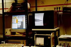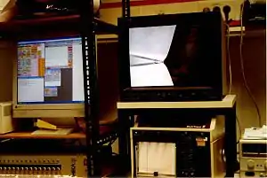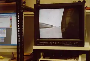 Огромная сфера, часть которой видна на мониторе в центре фотографии — это клетка (ооцит лягушки Xenopus laevis), находящаяся в данный момент на предметном столике микроскопа, к ней подведена patch-пипетка, её диаметр у носика — около 3 микрон. После установления гигаомного контакта она изолирует фрагмент мембраны площадью приблизительно 7 мкм², ток от ионных каналов в этом фрагменте можно будет записывать.