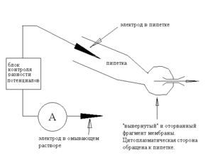 Теперь разность потенциалов на фрагменте мембраны строго равна разности потенциалов между электродами. Очевидно, что при использовании такой модификации пипетку заполняют раствором, имитирующим внеклеточную среду, тогда как омывающий раствор делают близким по составу к цитоплазме. При этом, меняя состав омывающего раствора, можно изучать, как такие изменения в цитоплазме влияют на ток интересующих нас каналов — ведь омывающий раствор контактирует с цитоплазматической стороной мембраны). При этом мы точно знаем как состав жидкости по обе стороны мембраны, так и разности потенциалов, что позволяет достаточно точно характеризовать каналы, используя биофизические уравнения Нернста и Гольдмана-Ходжкина-Каца. При этом, если в изолированный участок мембраны попал один канал, то мы наблюдаем поведение единичной молекулы и, если это лиганд-регулируемый канал-рецептор, то её взаимодействие с другими единичными молекулами.