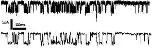 Запись одиночного канала рецептора глицина. Чётко видны два состояния: закрытое (ему соответствует нулевой ток) и открытое (ему соответствует ток примерно в 7 пикоампер). Канал время от времени спонтанно переходит из одного состояния в другое, промежуточных состояний нет. Запись позволяет получить две важнейшие характеристики канала: проводимость (исходя из величин трансмембранного потенциала и тока) и вероятность нахождения в открытом состоянии (определяемое как отношение времени, когда канал открыт, ко времени записи тока). К слову, чаще всего активность канала физиологически регулируется путём изменения этой вероятности.