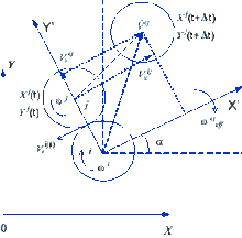 где Δt временной шаг, Vnij — зависимая скорость. Вращение пары автоматов может быть посчитано аналогично с связью последнего смешения.