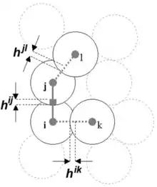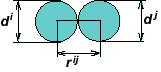 Параметр εij используется как мера деформации автомата i взаимодействующего с автоматом j. Где qij — расстояние от центра автомата i до точки его контакта с автоматом j; Ri=di/2 (di — размер автомата i).