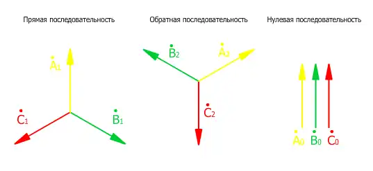 Обратную последовательность составляют векторы , и , одинаковой длины и сдвинутые друг относительно друга на 120o. Вектор опережает вектор , а вектор опережает вектор .