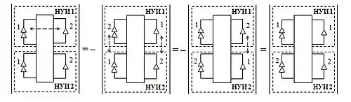 К описанному базису простейших схем целесообразно также добавить схемы на рис. 1,н и рис. 1,о, состоящие из двух контуров с ИНУН или ИТУТ соответственно, так как нейтрализация одного из УИ приводит к получению схемы-узла. Аналогичным свойством обладают обобщения этих схем, которые состоят из m контуров с УИ (m>2) и имеют определители Δ=K1 • K2 • … • Km+1 и Δ=B1 • B2 • … • Bm+1 соответственно.