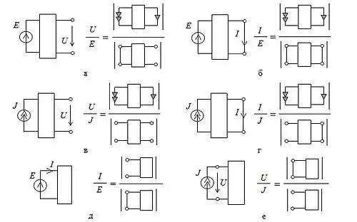 Любая схемная функция электрической цепи может рассматриваться как отношение N/D[9]. Числитель N здесь является определителем схемы, в которой независимый источник и ветвь искомого отклика замещаются нуллором, а знаменатель D — определителем схемы с нейтрализованными входом и выходом. На рис. 2 эти правила проиллюстрированы схемно-алгебраическими формулами для шести известных схемных функций: коэффициента передачи по напряжению (рис. 2,а), передаточного сопротивления (рис. 2,б), передаточной проводимости (рис. 2,в), коэффициента передачи по току (рис. 2,г), входных проводимости (рис. 2,д) и сопротивления (рис. 2,е) соответственно[10].