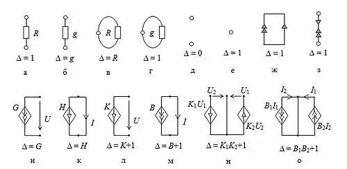 где χ є (R, g, K, G, H, B); Δ(χ→∞) — определитель первой производной схемы, полученной из исходной схемы в результате присвоения параметру χ значения, стремящегося к бесконечности (сопротивление удаляется, проводимость заменяется на схеме идеальным проводником (стягивается), управляемые источники заменяются на нуллоры)[4]; Δ(χ=0) — определитель второй производной схемы, которая образована в результате нейтрализации выделяемого элемента, то есть принятия χ=0 (сопротивление стягивается, проводимость удаляется, управляемые источники нейтрализуется). В качестве определителей будем рассматривать символьные определители, то есть аналитические выражения, в которых все параметры схемы представлены символами, а не числами[5][6]. Нуллором называют схемную модель идеального усилителя Теллегена[7], то есть управляемый источник, параметр которого стремится к бесконечности. Нуллор является аномальным управляемым источником, поскольку ток и напряжение норатора (управляемой ветви нуллора) не определены, а ток и напряжение нуллатора (управляющей ветви нуллора) равны нулю. При замещении управляемого источника его управляемая и управляющая ветвь заменяются на норатор и нуллатор соответственно. При нейтрализации управляемая ветвь напряжения и ветвь управляющего тока стягиваются, а управляемая ветвь тока и ветвь управляющего напряжения удаляются. Идеальный проводник и разомкнутая ветвь являются частными случаями включения нуллора. Идеальный проводник эквивалентен однонаправленному параллельному соединению норатора и нуллатора, а разомкнутая ветвь — их встречному последовательному соединению. При изменении направления норатора или нуллатора знак определителя схемы, содержащей эти элементы, изменяется на противоположный. Если конденсаторы задать в операторном виде ёмкостными проводимостями рС, а индуктивности — индуктивными сопротивлениями pL, то результатом разложения символьного определителя схемы по формулам (1)-(3) становится выражение, не содержащее дробей, что делает его простым и удобным в рассмотрении. Схемные элементы по формуле (3) выделяются рекурсивно до тех пор, пока не будет получена простейшая схема, определитель которой выводится из закона Ома (например, разомкнутые сопротивление или проводимость (рис. 1,а и б), замкнутые на себя сопротивление или проводимость (рис. 1,в и г), два несоединенных узла (рис. 1,д), одиночный узел (рис. 1,е), контур с нуллором (рис. 1,ж), разомкнутая ветвь с норатором и нуллатором (рис. 1,з), контур с УИ (рис. 1,и-м)).
