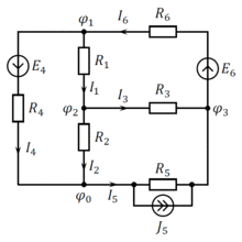 - минус потенциалы узлов, примыкающих к данному, умноженные на проводимости рёбер, соединяющих их с данным узлом. Если узел соединён с данным узлом ребром, содержащим источник тока, этот узел не принимается в расчёт.